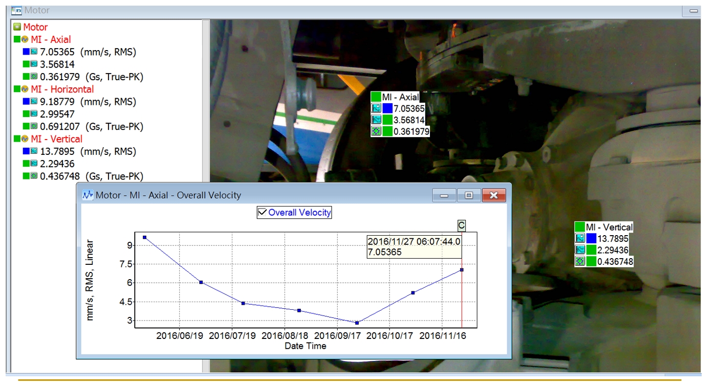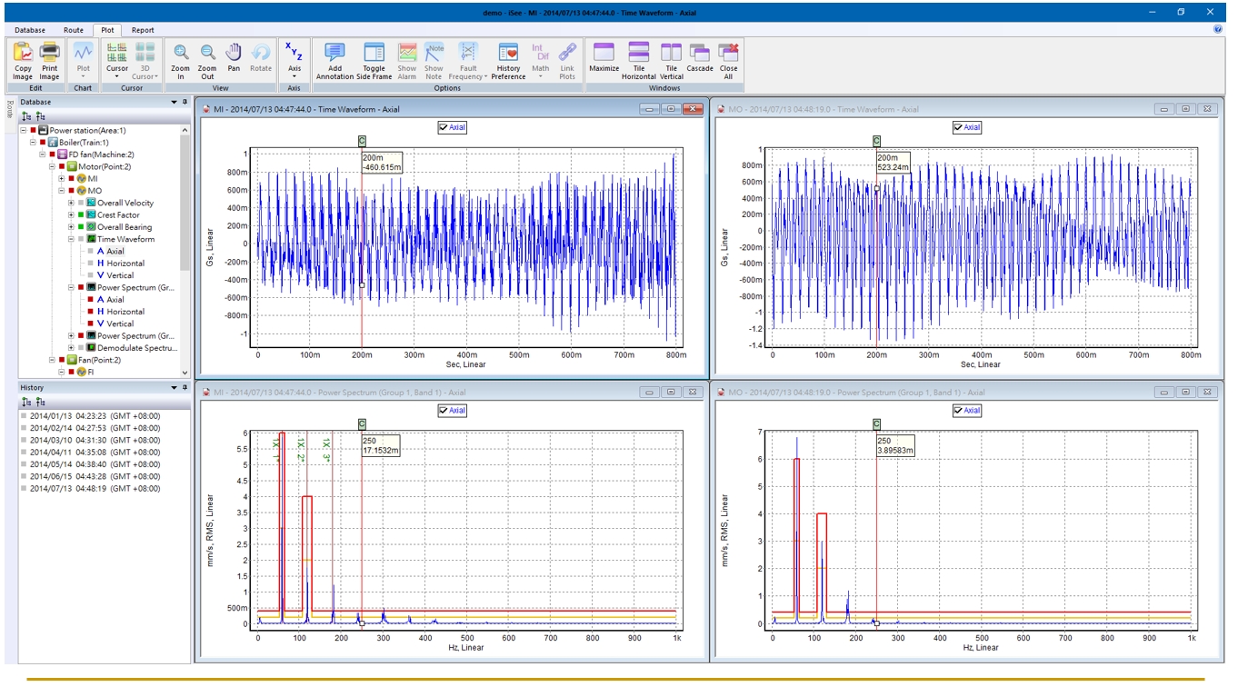 振動資料可顯示總量及頻譜,並可針對各測點分別顯示其歷史趨勢圖、瀑布圖及軸承頻率顯示等。